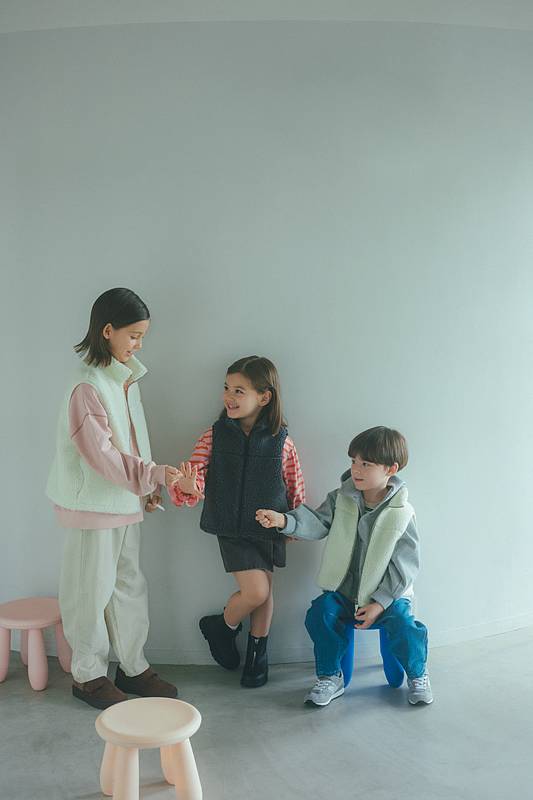 「ユナイテッドアローズ グリーンレーベル リラクシング」の“スタメン”は、キッズが“着たい・着心地がいい”と感じて、ママ・パパが“着てほしい・お手入れがラク・何枚もそろえたい”と思えるような、親子が“両想い”になれるアイテムを目指したキッズウェアシリーズ。アイテムの開発には、子育て中のママ・パパによる座談会が重ねられ、リアルな声が反映されているのが特徴です。今季は、パーカやベスト、ブルゾンといった秋冬シーズンにぴったりな全6アイテムがラインナップ。