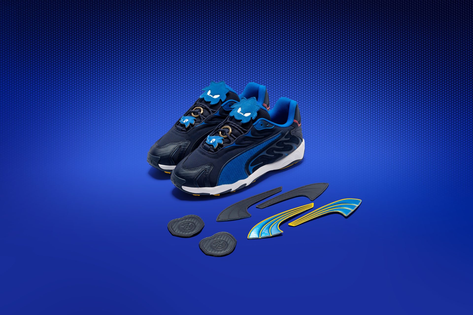 今回リリースされるスニーカーは“INHALE(インヘイル)”と“INVERSE(インバース)”で、どちらも「プーマ」のシューズがベースとなっており、ソニックに登場するキャラクターからインスパイアを受け、特別仕様にデザイン。ソニックはブルーの“INHALE”で、シャドウとテイルスはブラックとレッド、イエローをまとった“INVERSE”となる。注目すべきは、それぞれのシューズにはキャラクター型のシュラウドや着脱式のヒールタブ、交換可能なフォームストリップなど、遊び心のあるカスタマイズ要素があること。タン部分のデザインにはキッズも喜ぶはず。