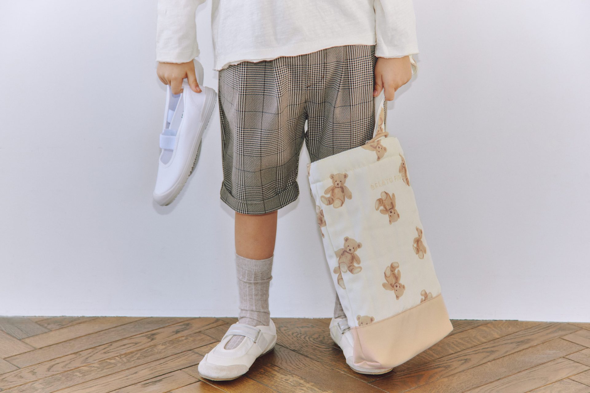 体操着や着替え、またはお弁当や歯ブラシなど、サイズによって用途を使い分けたい巾着バッグは、3サイズ展開。Lサイズはマチのないすっきりとしたサイズにまとまっているので、バッグの中でもかさばらないので安心です。そしてシューズバッグは、撥水加工を施したキルト生地で作られているので、毎日の使用でも問題なく使える一品。持ち手をループに通す仕様で、小さな手でも扱いやすい形が魅力的です。