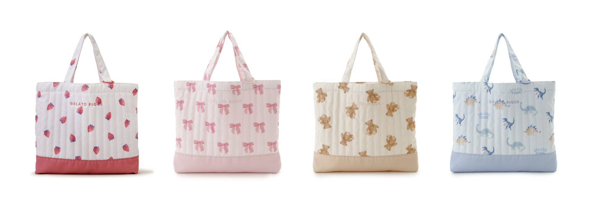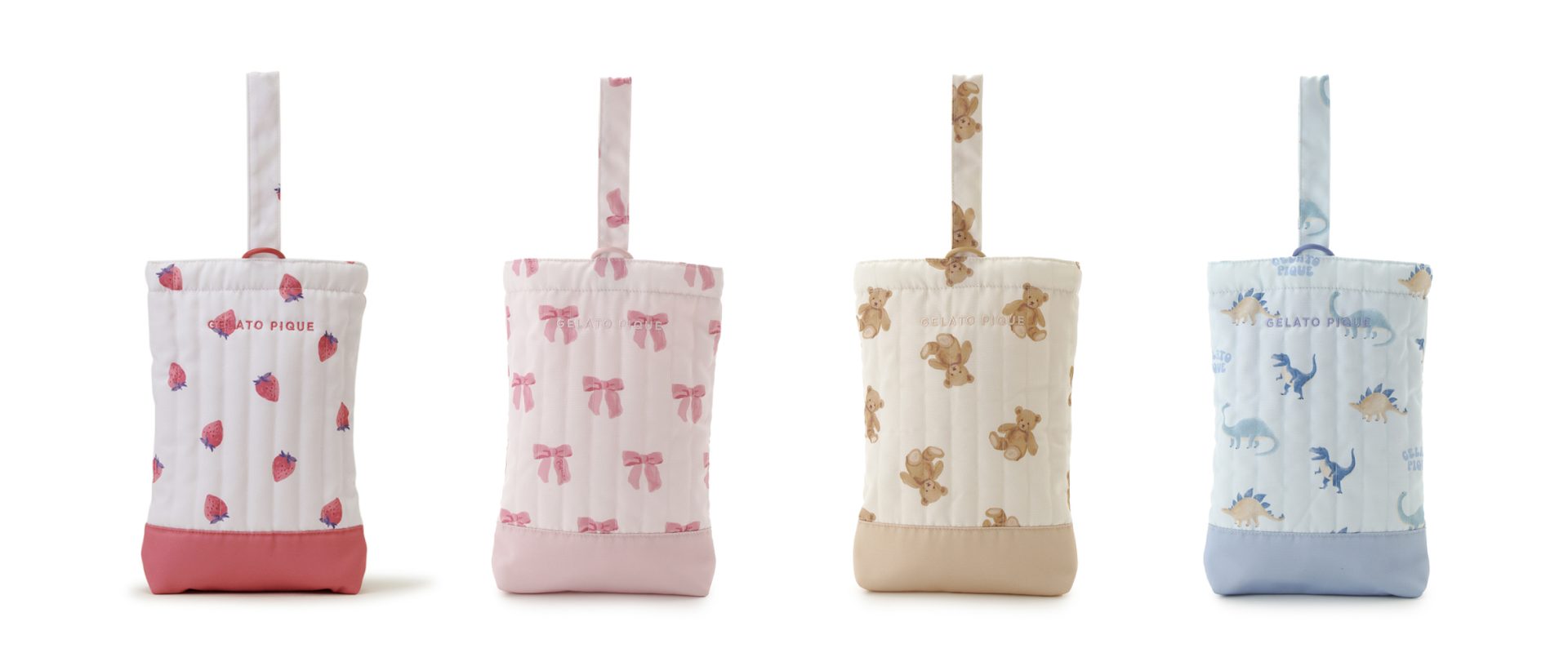 今回リリースされる新作グッズは、ストロベリー、リボン、ダイナソー、ベアの4つのモチーフでデザインされており、入園・入学や新学年のスタートにぴったりなアイテムがラインナップしています。バッグ類の生地は使いやすさを考慮して、撥水加工を施しているので安心です。